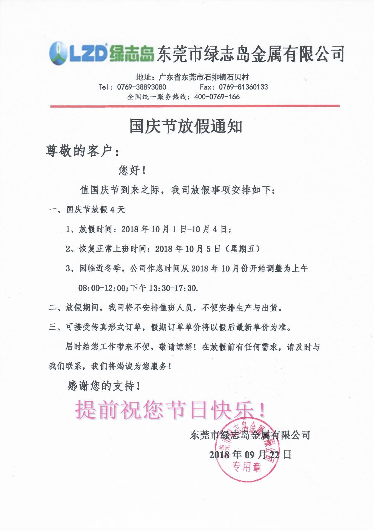 綠志島2018年國慶放假通知